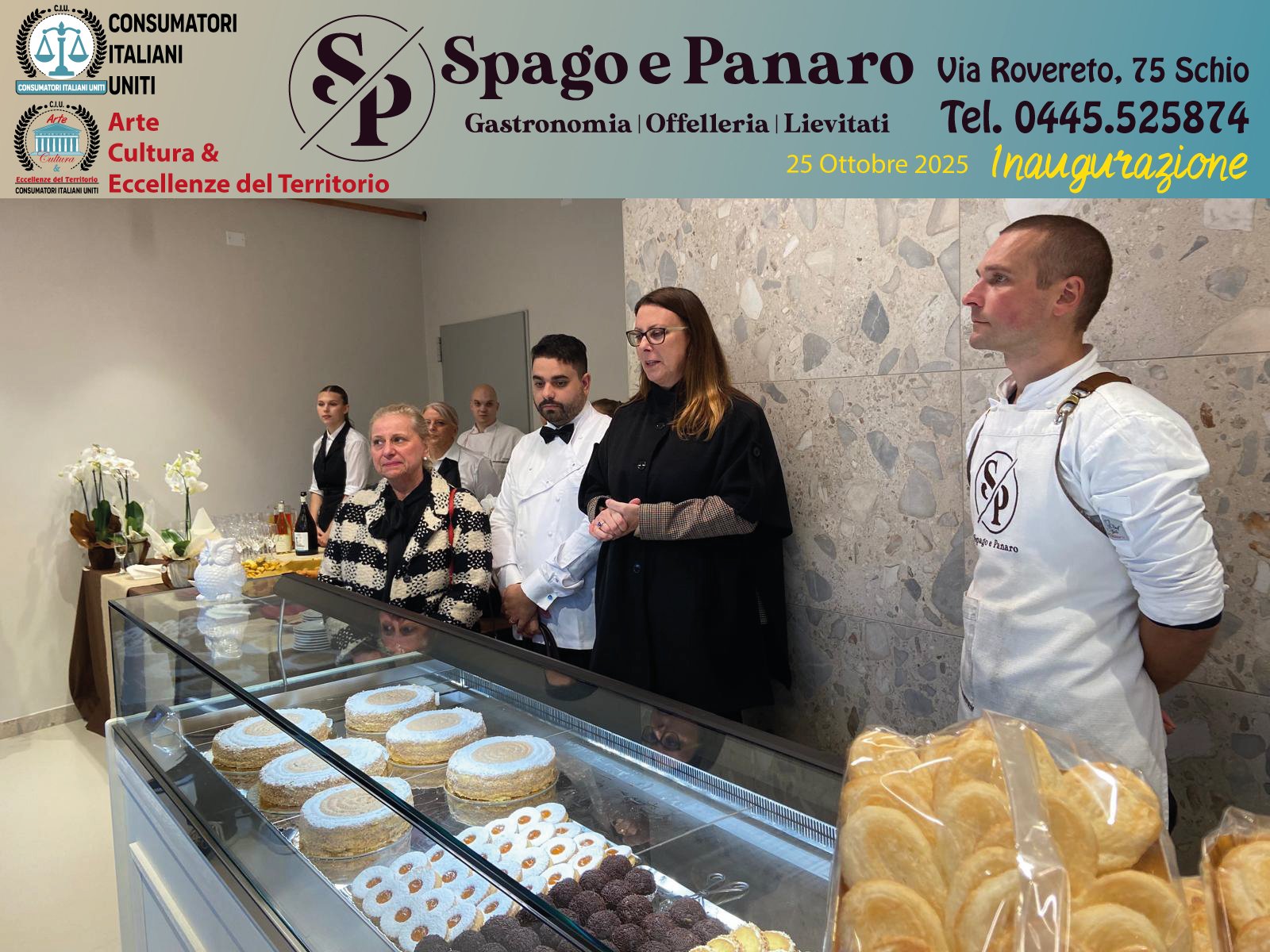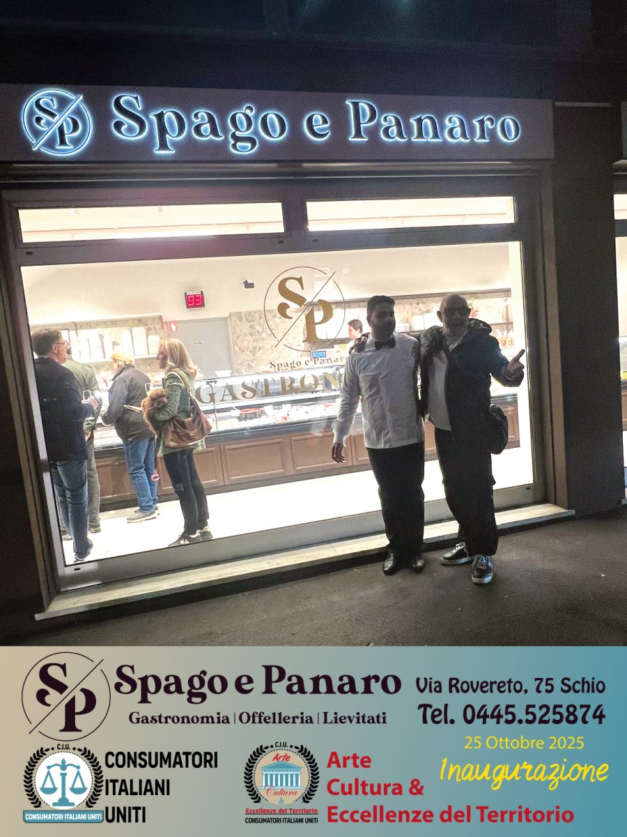 Sabato 25 Ottobre 2025 il nostro Dario, nella veste di reporter per la rubrica di Consumatori Italiani Uniti intitolata Arte, Cultura & Eccellenze del Territorio, ha partecipato all'inaugurazione della Gastronomia, Offelleria e Lievitati SPAGO E PANARO sita in Via Rovereto, 75 a Schio.
